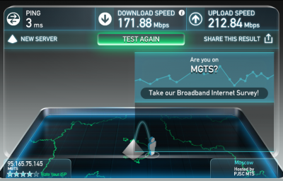«Очень удобно проверять скорость с помощью программки от МГТС. Все наглядно, быстро, онлайн, лишний софт не засоряет комп. Скорость в разное время суток, бывает, отходит от заданных 200 Мбит в секунду, но не слишком. В целом выдерживается. Хороший провайдер, отвечает за свои слова». Виктор Шепетков
